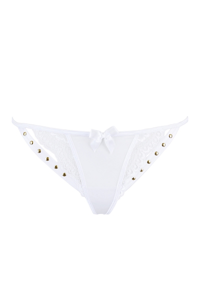 Lingerie fantaisie soignée, ce string blanc joliment échancré, composé de jersey et de dentelle, est souligné d'une série de clous dorés sur les cotés.